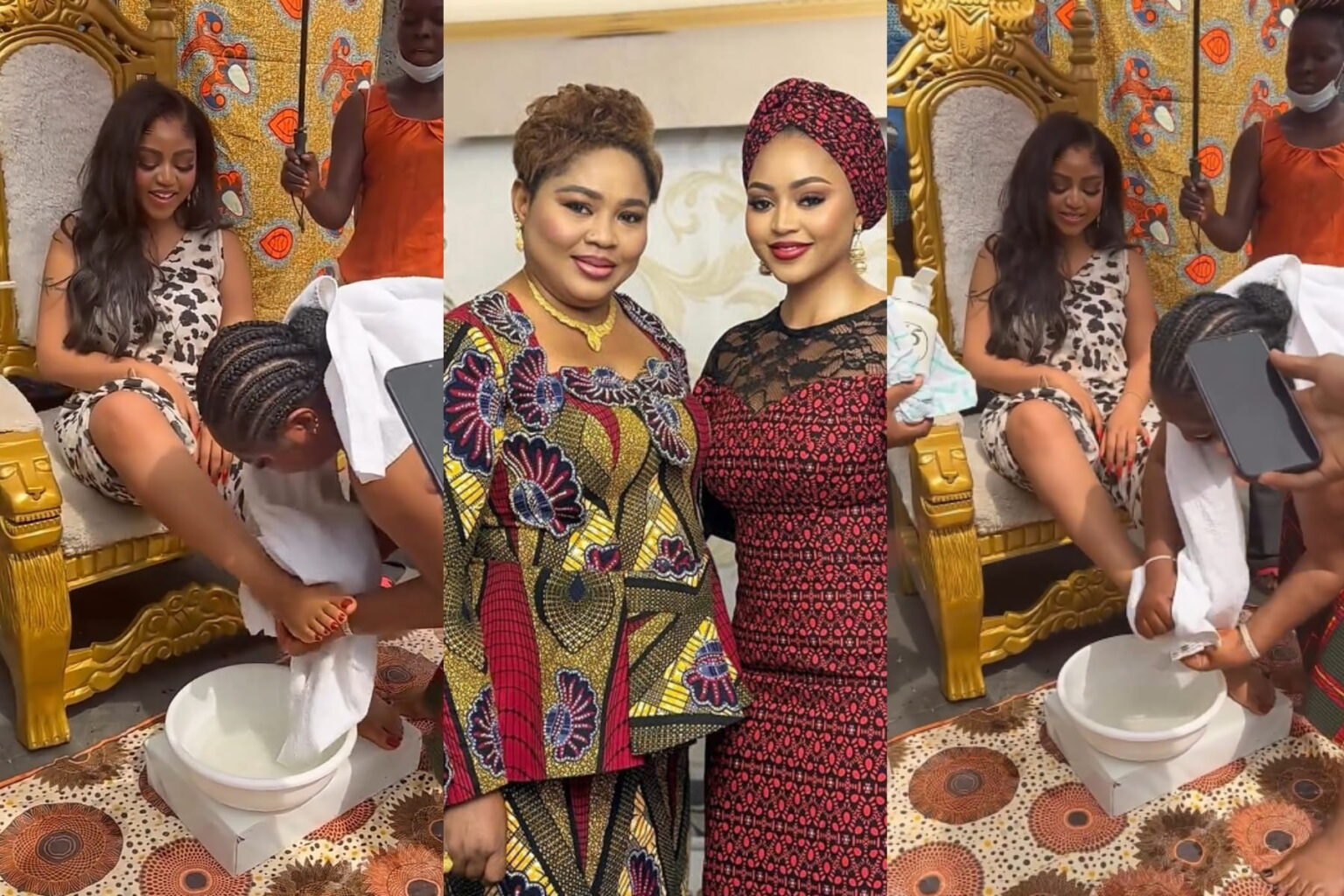 In the viral clip, Rita is seen receiving Regina in grand style following her return from an overseas trip. The proud mother sat elegantly on a white-and-gold chair while attendants held two umbrellas to shield both women from the sun. In a striking display of affection and reverence, Rita went further to wash her daughter’s feet in a bowl of warm water, all while offering heartfelt prayers.